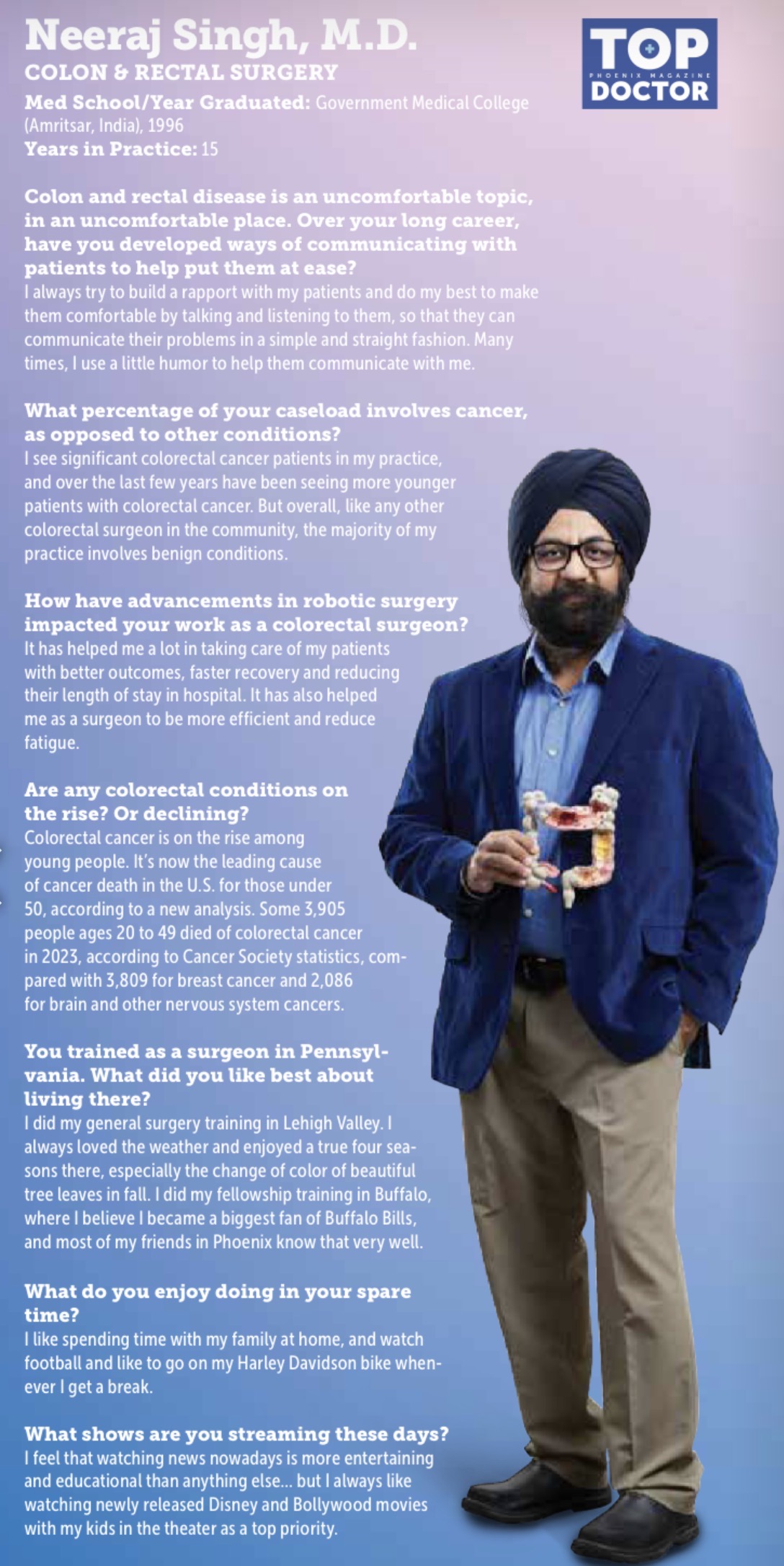 Colon and rectal surgeons are experts in the surgical and non-surgical treatment of diseases of the colon, rectum, and anus. They have completed advanced surgical training in the treatment of these diseases, as well as full general surgical training. They are well versed in the treatment of both benign and malignant diseases of the colon, rectum, and anus and are able to perform routine screening examinations and surgically treat conditions as and if needed. Dr Singh is a double board certified in Colon and Rectal Surgery and General surgery. His practice is located in Phoenix, Glendale and Scottsdale, AZ.